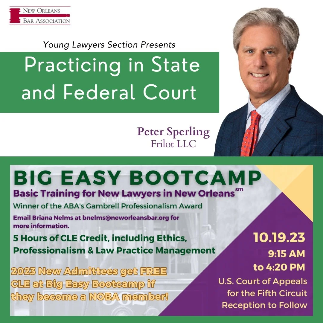 Peter Sperling will present “Practicing in State and Federal Court” at the New Orleans Bar Association’s New Orleans Bar Association’s (NOBA) Big Easy Bootcamp on October 19, 2023. The presentation will explore thesimilarities and differences between litigating in State and Federal Court. Learn how, when, and what you need to file in each court. This includes the necessary documents, the best methods for filing, and when you can expect to be heard.